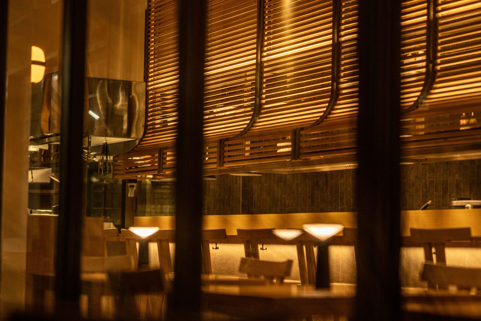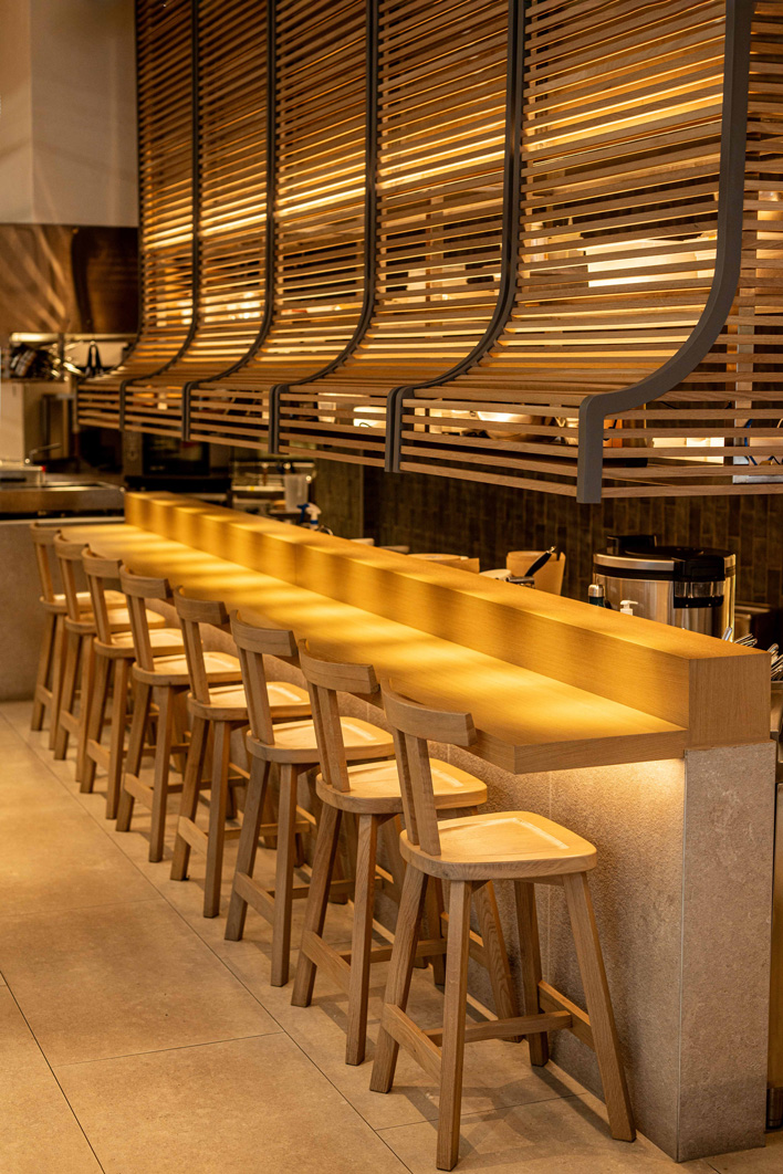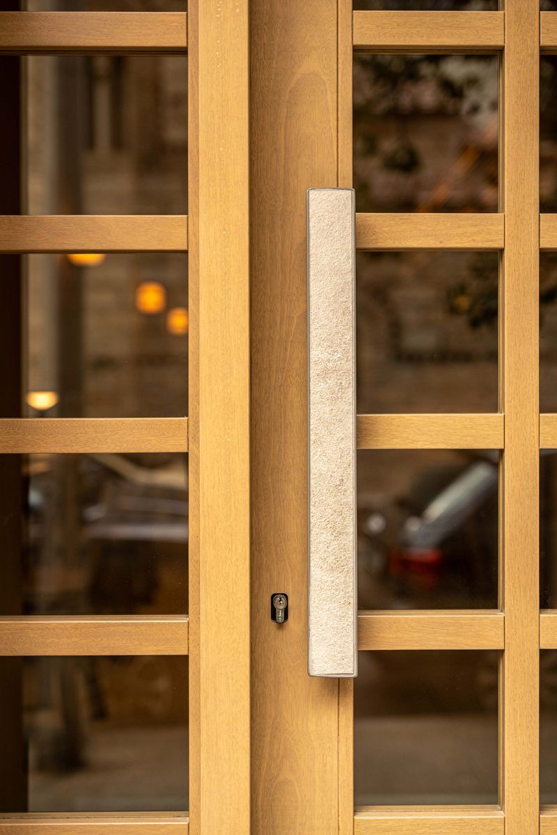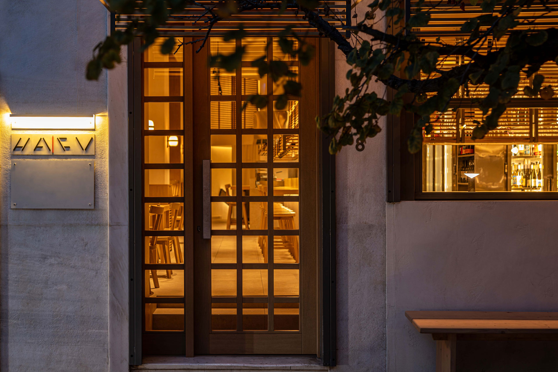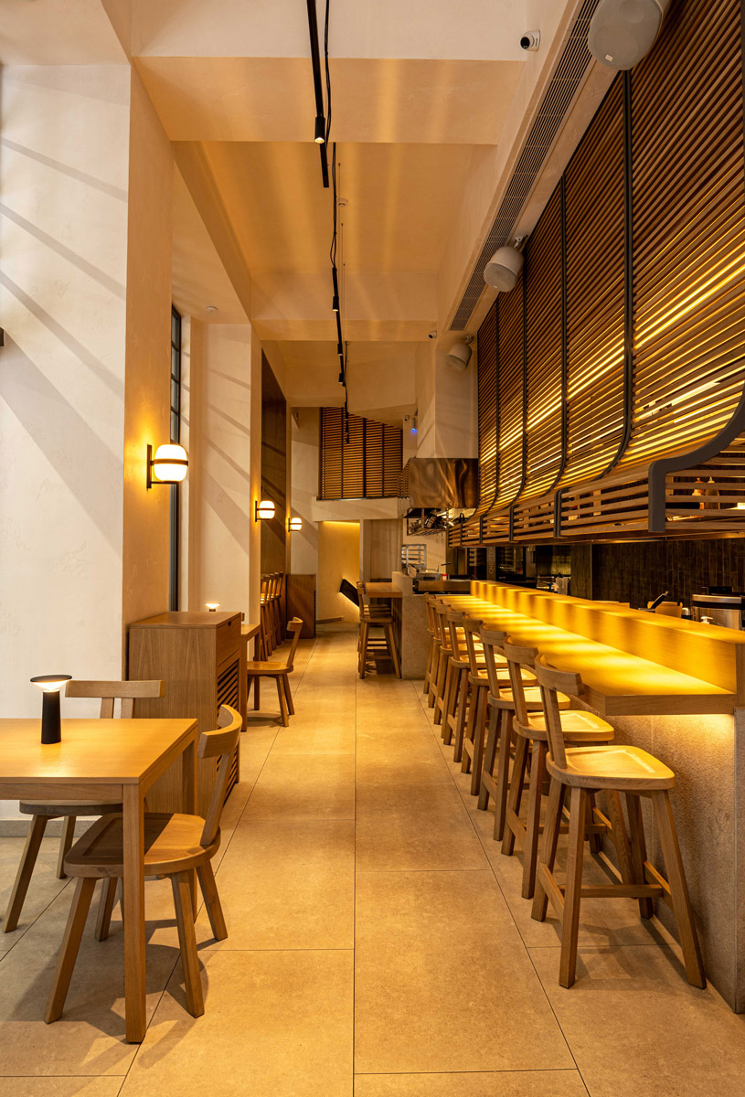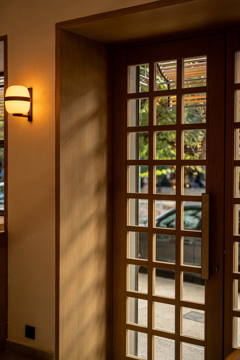 The space breathes through dualities and contrasts, as suggested by the restaurant’s name, HAFU: East meets West. Perforated wooden partitions on the islands create gradients of visual connection between inside and out. The clarity of Japanese lines and the austerity of metal elements enter into dialogue with the warm tones of Greek wood, while the texture of the walls bears the marks of the handmade, drawing references from the wabi-sabi technique — the beauty of imperfection, wear, and the natural. Contemporary and historic elements converse. The color palette remains earthy and light, allowing shadows and natural light to generate depth and movement. The material imprint is layered: rough tiles with the feel of natural stone, warm woods, and cool metal coexist without overpowering one another.