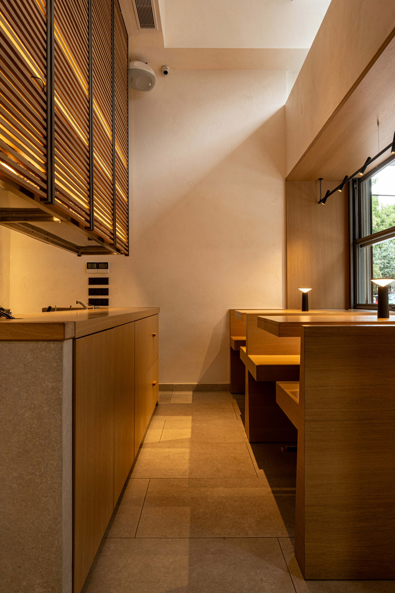 The architectural composition is structured around a dual axis of interpretation: contemplative rigor and warm simplicity. The project respects the existing structure of the arcade, allowing the shell to narrate its own history, while intervening internally through clean, minimal gestures that redefine the relationship between light, matter, and the body. A system of three free-standing islands is designed within space, around which all activity unfolds. The restaurant becomes an architectural narrative of the senses and a meeting point of two worlds. Kitchen and dining area coexist. Movement between the islands, the counters, and the small seating alcoves evokes a quiet curiosity — as if one is constantly discovering new details, while a ritual unfolds before us.